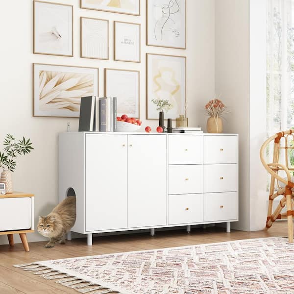 Cat House Storage Cabinet Side Table with 6-Drawer Cat Litter Box Enclosure,Wood Television Stand For Living Room,White