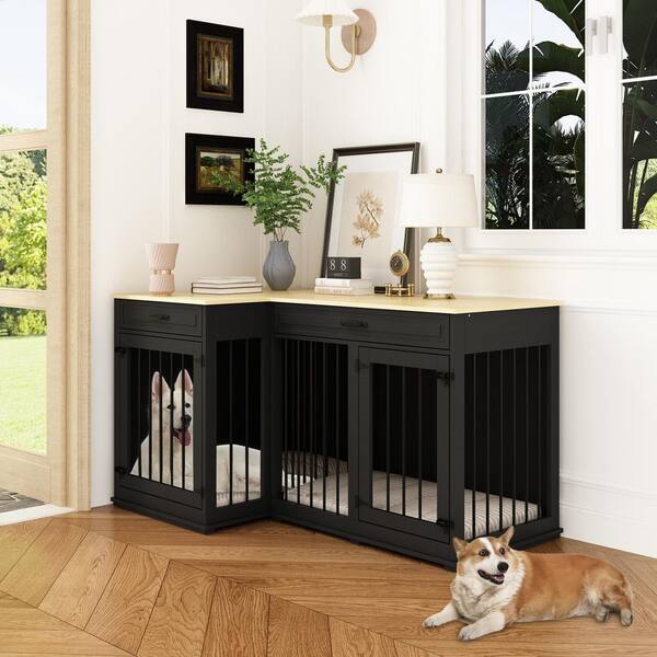 Large Corner Dog Crate Furniture For 2 Dogs With 2 Drawers, Wooden Black Corner Dog Kennel Cage Perfect for Limited Room