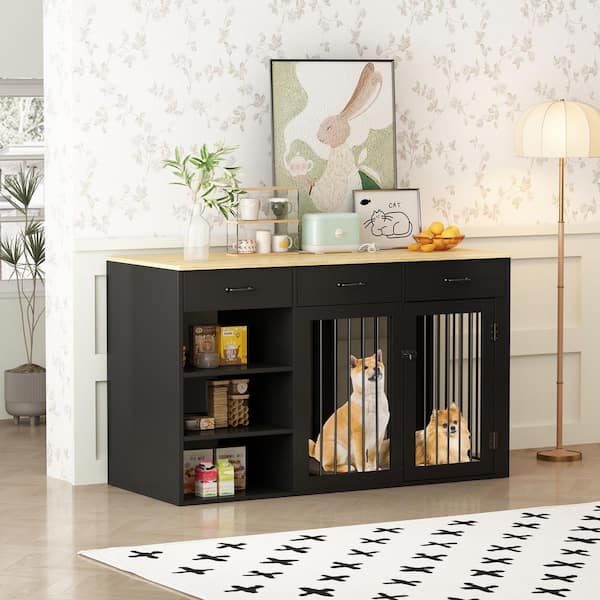 Large Dog Crate Furniture with 3-Drawers and 3-Shelves, Wooden Heavy-Duty Dog Crate Storage Decorative Dog Pens, Black
