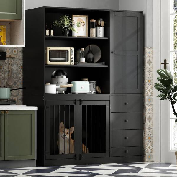 Large Dog Kennel Furniture Style Dog Crate Storage Cabinet Dog Crate with Dog Bowl 1 Cabinet 3-Shelves, 4-Drawers, Black