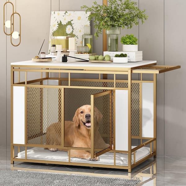 Large Dog Kennels Crate, Indoor Dog Crate End Table, Mesh and Wooden Dog Cages with 2-Doors for S, M, L Dogs, White Gold