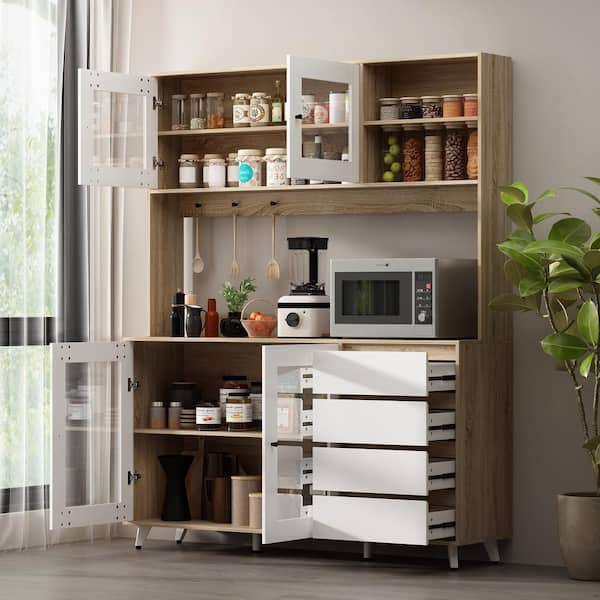Light Brown Large Kitchen Pantry Cabinet Buffet with 4-Drawers, Hooks, Open Shelves and Glass Doors