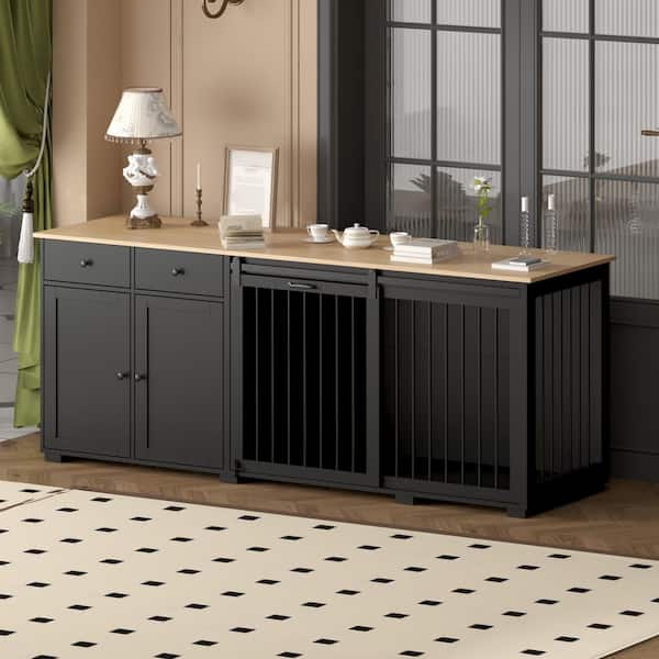 Modern Large Wooden Dog Kennel Furniture Storage Cabinet, Pet Dog Cage with 2 Drawers and Sliding Door for Dogs, Black