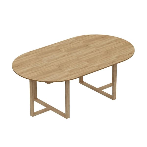 Modern Light Oak Wood MDF Top 82.7 in. Trestle Base Dining Table Seats 8 Extendable Oval Shape