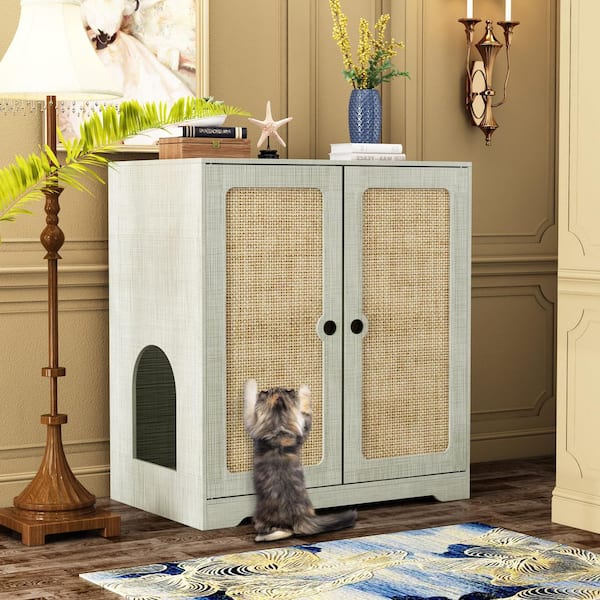 Modern Litter Box Enclosure With Sisal Door, Indoor Wooden Hidden Cat Washroom Storage Cabinet with Cat Holes, Gray