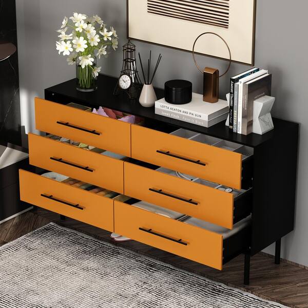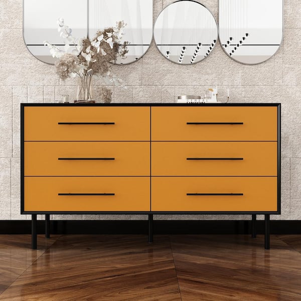 Orange Wood 6-Drawer 55.1 in. W Wood Dresser Chest of Drawer with Metal Legs, Anti-Tip Device