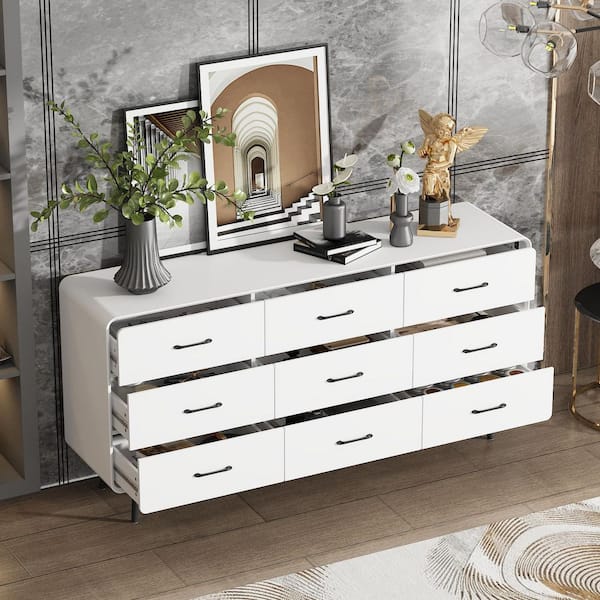 Pure White 9-Drawer 63 in. W Chest of Drawers, Rounded Wooden Storage Sideboard with Black Legs Height 5.9 in.