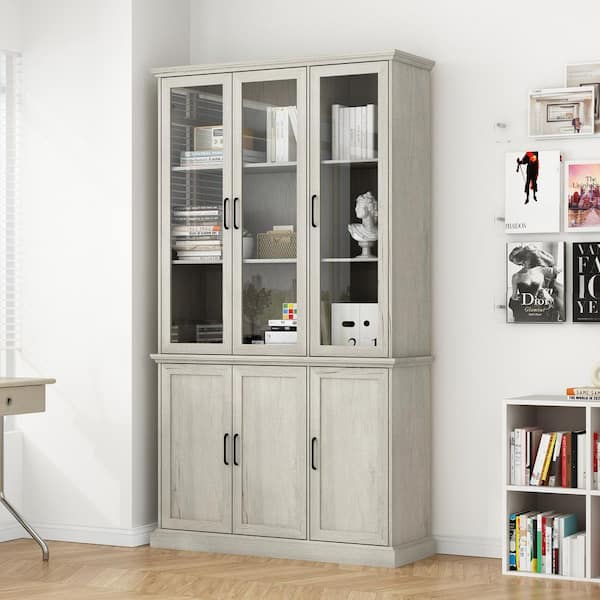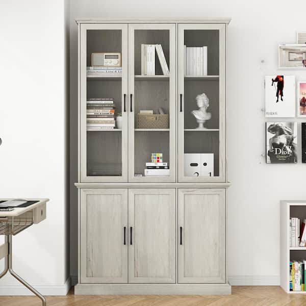 Vintage style Beige Wood Grain Wooden 46.3 in. W Sideboard, Bookcase, Storage Cabinet with 10 Shelves & 6 Doors