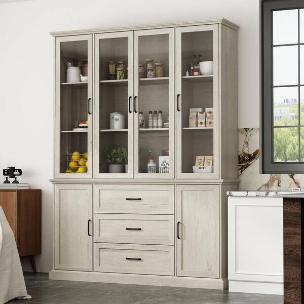 Vintage style Beige Wood Grain Wooden 61 in. W Sideboard, Bookcase, Storage Cabinet with 13 Shelves, 3 Drawers & 6 Doors