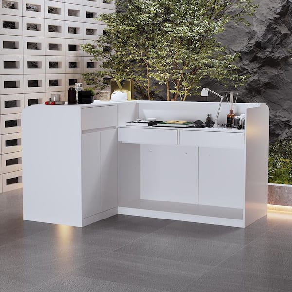 White 39.4 in H L-Shape Bar Cabinet, Wine Cabinet, Reception Desk, Kitchen Island with 17-Shelf, 2-Doors and 3-Drawer