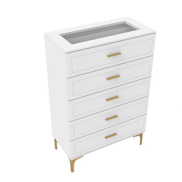 White 47.2 in. Height Wooden Storage Cabinet, Chest of Drawers with 5-Tier Drawers for Jewelry Storage and Glass Top