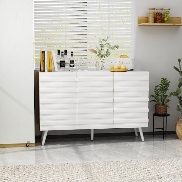 White Wood 47.2 in. Width, Sideboard, Storage Cabinet, Dresser with 4 Shelves and Wavy Alternating Stripes Surface