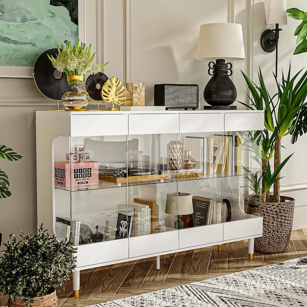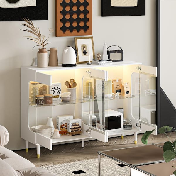 White Wood 55.1 in. W Display Cabinets Storage Cabinet With Tempered Glass Shelves and Doors, LED Lights