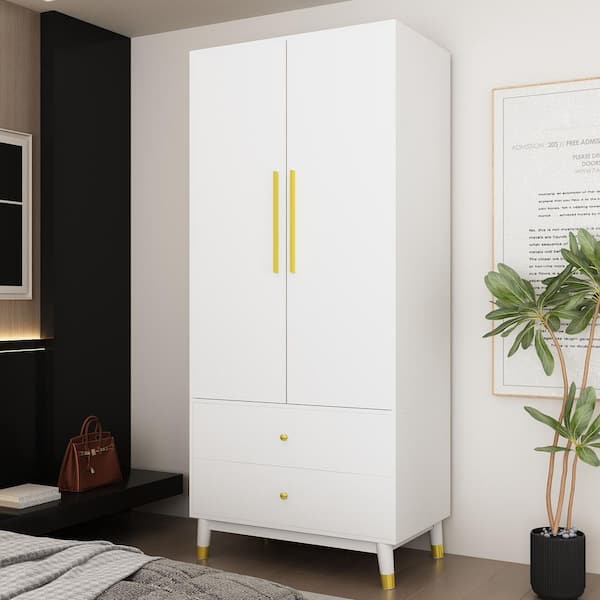 White Wooden 31.5 in. Width Armoire, Wardrobe with 1-Large Shelf, Hanging Bar and 2-Drawers