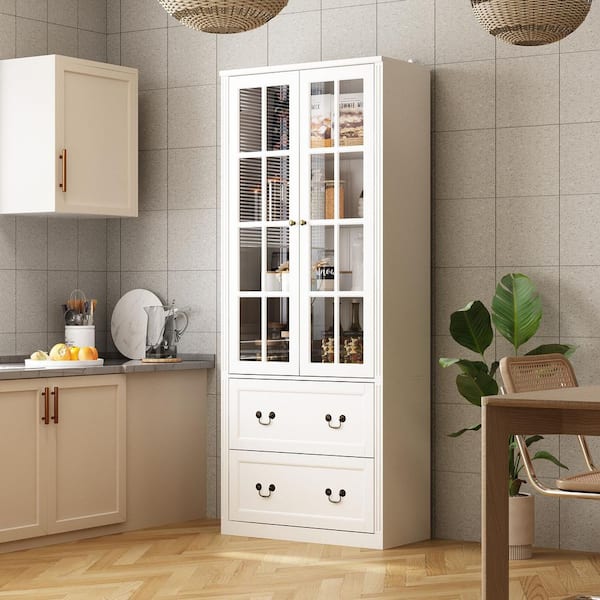 White Wooden Accent Storage Cabinet Freestanding Cupboard With Adjustable Shelves and Tempered Glass Doors, Drawers