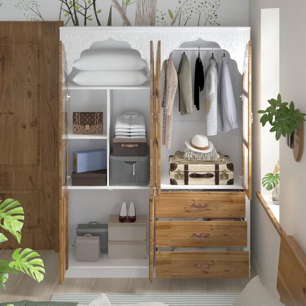 White and Brown Paint Finish Wood 57.5 in. W Bedroom Armoire in Victorian Style, With Glass Doors, Hanging Rod, Drawers
