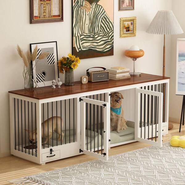 Wooden Large Dog Crate with Dog Feeding Area, XL Large Furniture Style Dog Kennel with Removable Irons for 2 Medium Dogs