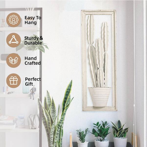 Distressed White Metal Cactus Wall Decor with Wood Frame