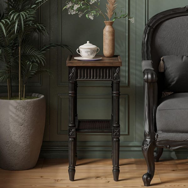 Rustic 13 in. Black Rectangular MDF End Table with Espresso Tray Top and Woven Wicker Shelf