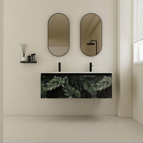 18 in. W x 17 in. H x 48 in. D Black Floating Wall-Mounted Bath Vanity in Feather Pattern with 2 Sinks White Ceramic Top
