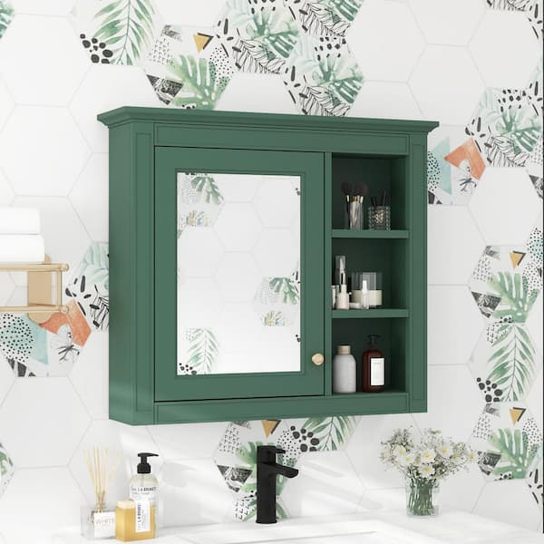 29.92 x 7.32 x 28 In. Green Wall Mounted Modern Bathroom Storage Cabinet with Door Mirror and 3-Open Storage Dividers