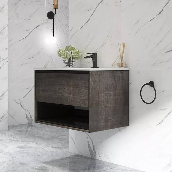 32 in. W x 18 in. D x 20 in. H Bath Vanity in Brown (Plaid Grey Oak) with White Ceramics Top