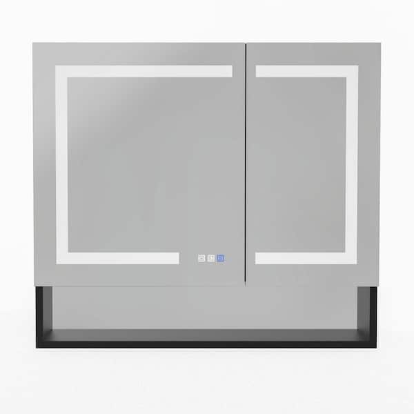 36 in. W x 32 in. H Rectangular Black Aluminum Recessed/Surface Mount Medicine Cabinet with Mirror, LED and Clock