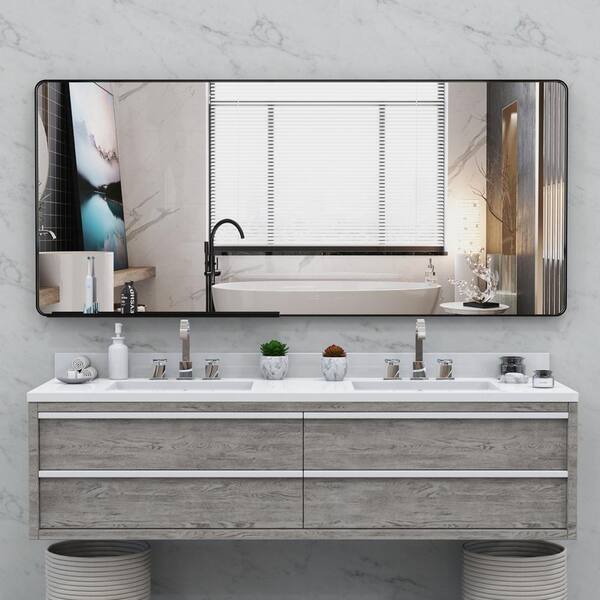 72 in. W x 32 in. H Oversized Rectangular Framing Wall Mounted Bathroom Vanity Mirror in Black with Curved Corner