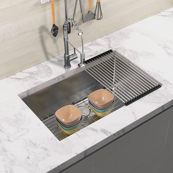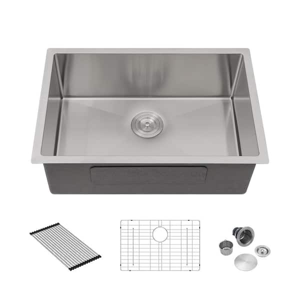 Silver(Brushed Nickel) Stainless Steel 27 in. L Single Bowl Undermount 16 Gauge Kitchen Sink With Bottom Grid