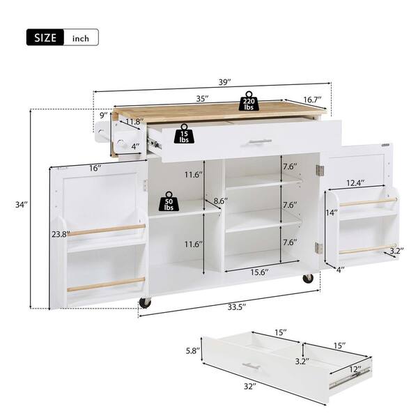 White Wooden 39 in. Kitchen Island with 1 Drawer, Internal Storage Rack and Rubber Wood Top, Rolling Type