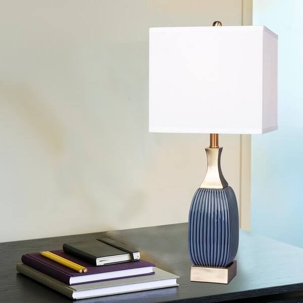 26.5 in. Vertically Ribbed Blue Ceramic and Antique Brass Table Lamp (2-Pack)