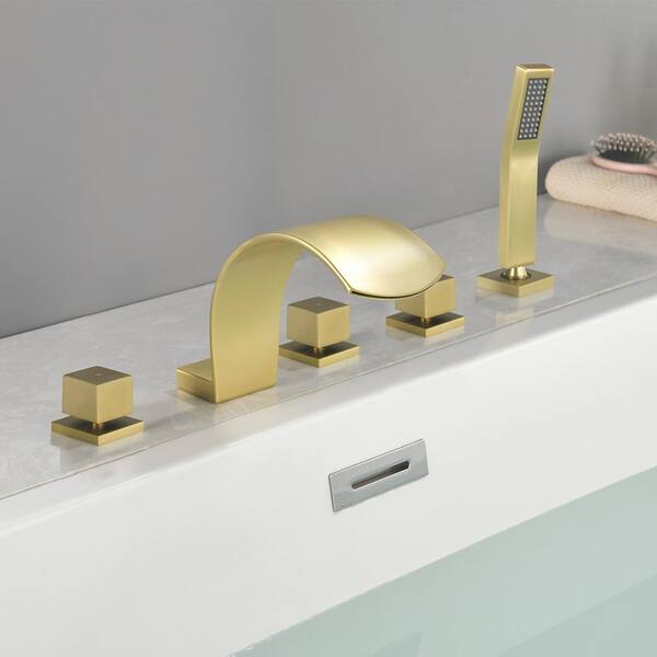 3-Handle Deck-Mount Roman Tub Faucet, 5 Hole Waterfall Bathtub Shower Faucet with Hand Shower in Brushed Gold
