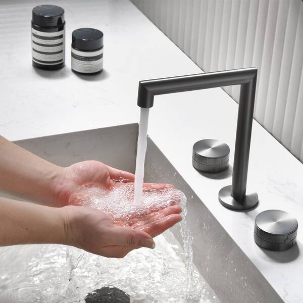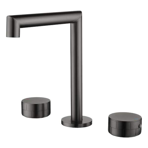 Deck Mount Double Handle High Arc Bathroom Faucet, 3-Holes Modern Bathroom Faucet in Gunmetal Gray