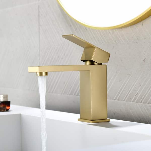 Single Handle Single Hole Bathroom Faucet with Deckplate&Drain Included, Square Bathroom Faucet in Brushed Gold