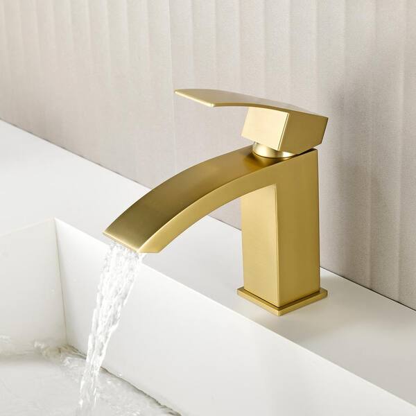 Single Handle Single Hole Bathroom Faucet with Deckplate and Drain Included, Square Bathroom Faucet in Brushed Gold