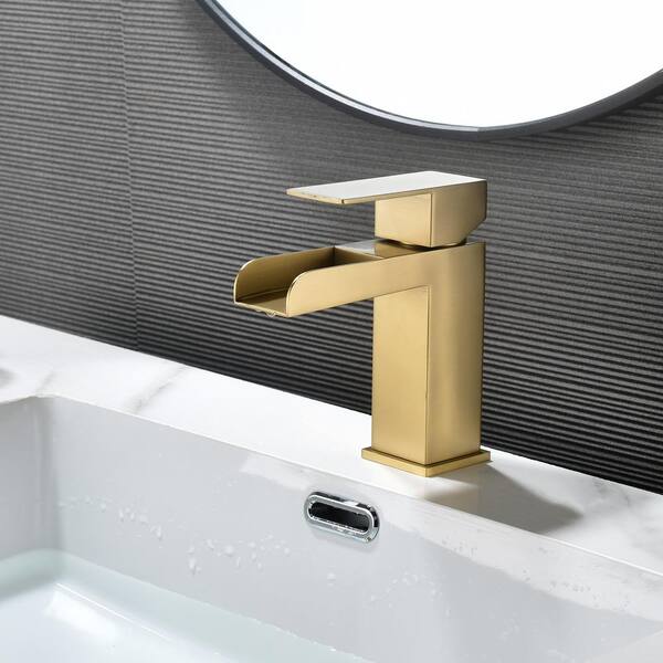 Single Handle Single Hole Bathroom Faucet with Deckplate and Drain Included, Waterfall Bathroom Faucet in Brushed Gold
