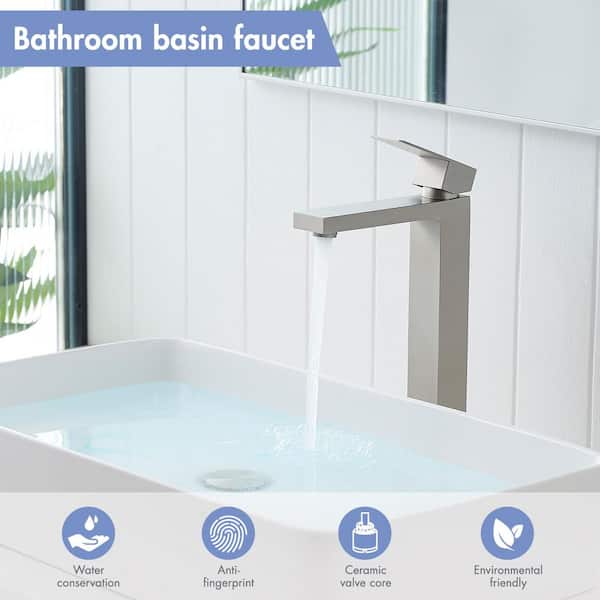 Single Handle Vessel Sink Faucet with Pop Up Drain, Single Hole Tall Bathroom Faucet in Brushed Nickel
