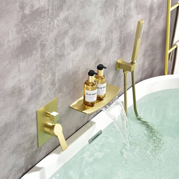 Single-Handle Wall Mount Roman Tub Faucet with Hand Shower, Wide Waterfall Bathtub Spout in. Brushed Gold