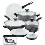 Freshen up easy, everyday meal-making and worry less about cleanup, with the brilliant cooking performance of the colorful, durable and dishwasher-safe Farberware PURECOOK Ceramic Nonstick 12-Piece Cookware Set. The quality begins with the innovative nonstick technology- a textured, quilted surface coupled with Farberware's ceramic nonstick to boost food release and an easier cleanup. The cookware's sturdy handles feature stainless steel accents and the shatter-resistant glass lids lock in the heat while allowing you to monitor the cooking process. This 12-piece cookware set is complete with three Prestige nylon kitchen tools- a slotted turner, a slotted spoon, and a solid spoon, all ideal for use in the ceramic nonstick pots and pans. The cookware is oven safe to 350* and includes the Farberware Lifetime Limited Warranty. Get the cooking performance generations have trusted with a bold, modern boost of style and nonstick cooking performance, with the Farberware PURECOOK Ceramic Nonstick 12-Piece Cookware Set.