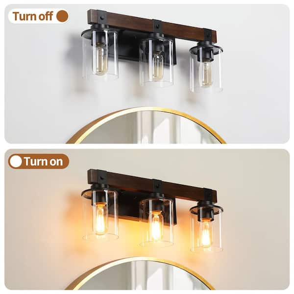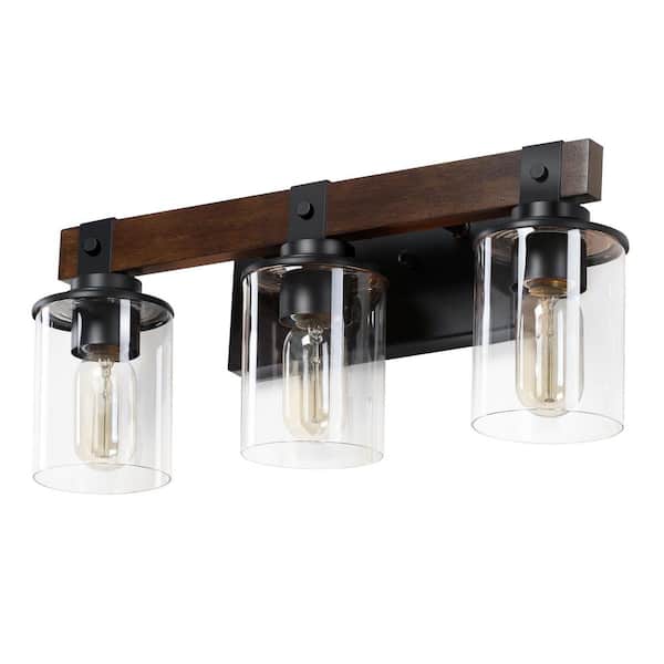 Farmhouse 18.5 in. 3-Light Walnut and Black Bathroom Vanity Light with Glass Shade