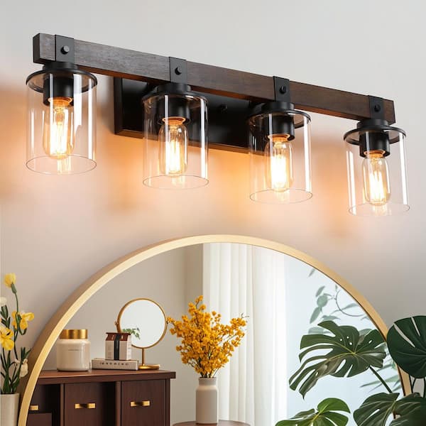 Farmhouse 27.2 in. 4-Light Walnut and Black Bathroom Vanity Light with Glass Shade