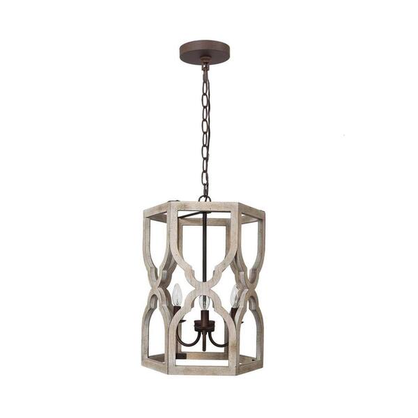 Farmhouse 3-Light Brown Candle Wood Drum Cage Chandelier for Kitchen with No Bulb Included
