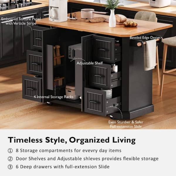 Farmhouse 56 in. Black 6-Drawer Cabinet Unit with Drop Leaf Power Outlet and Rolling Wheels for Outdoor Kitchen