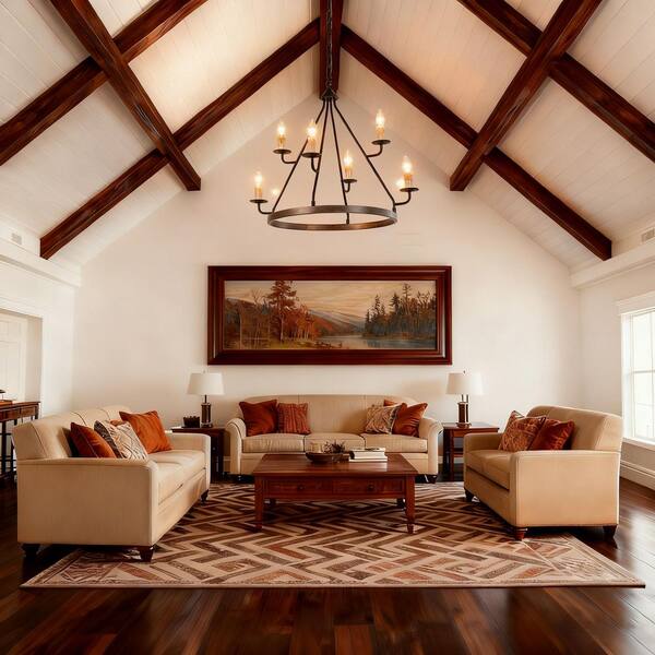 • Farmhouse chandelier with faux wooden accent and tiered candles