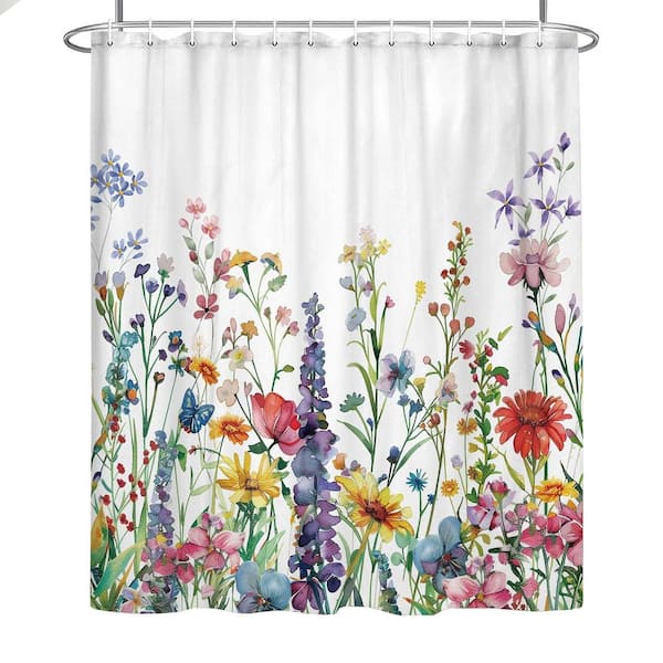 Farmhouse Rustic Boho Floral Shower Curtain 70x70 Botanical Watercolor Wildflower Aesthetic with Hooks White Polyester