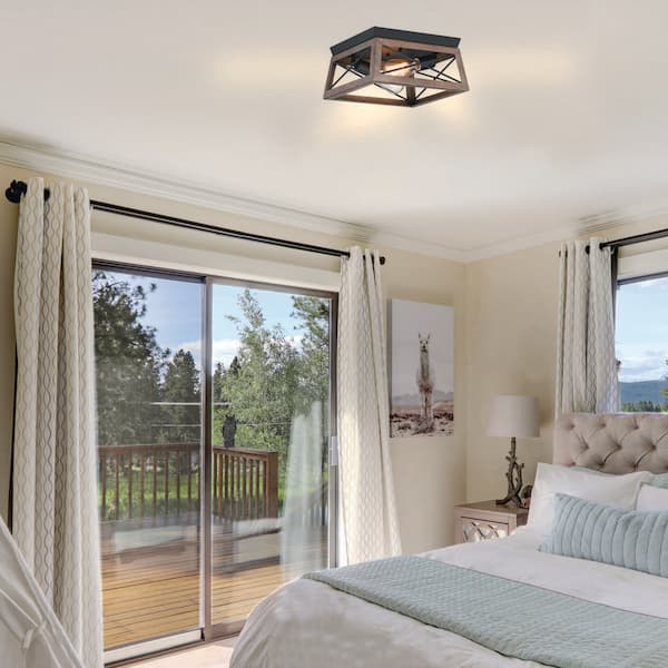 12 in. W. 2-Light Flush Mount with Matte Black finish and Bronze Wood Accents