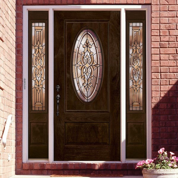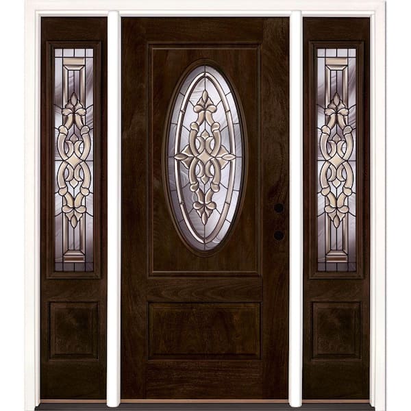 63.5 in.x81.625in.Silverdale Patina 3/4 Oval Lt Stained Chestnut Mahogany Lt-Hd Fiberglass Prehung Front Door w Sidelite