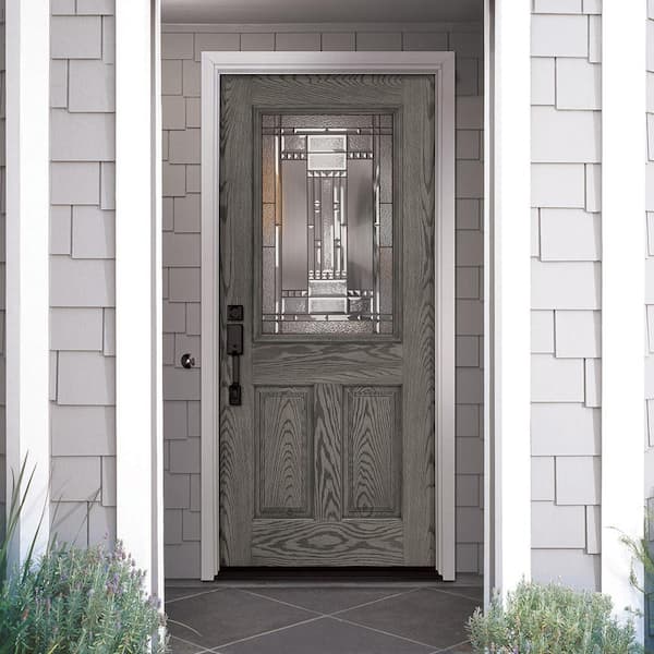 Preston 36 in. x 80 in. Left Hand Inswing Half Lite Decorative Glass Oak Stained Ash Fiberglass Prehung Front Door