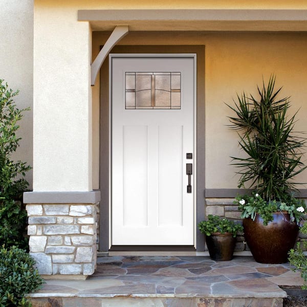 Tideland 36 in. x 80 in. Left Hand Inswing 1/4 Lite Decorative Glass Smooth Unfinished Fiberglass Prehung Front Door