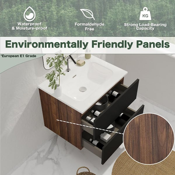 24 in. Wall-Mounted Floating Bath Vanity in Walnut and Black with Single Ceramic Sink Top in White